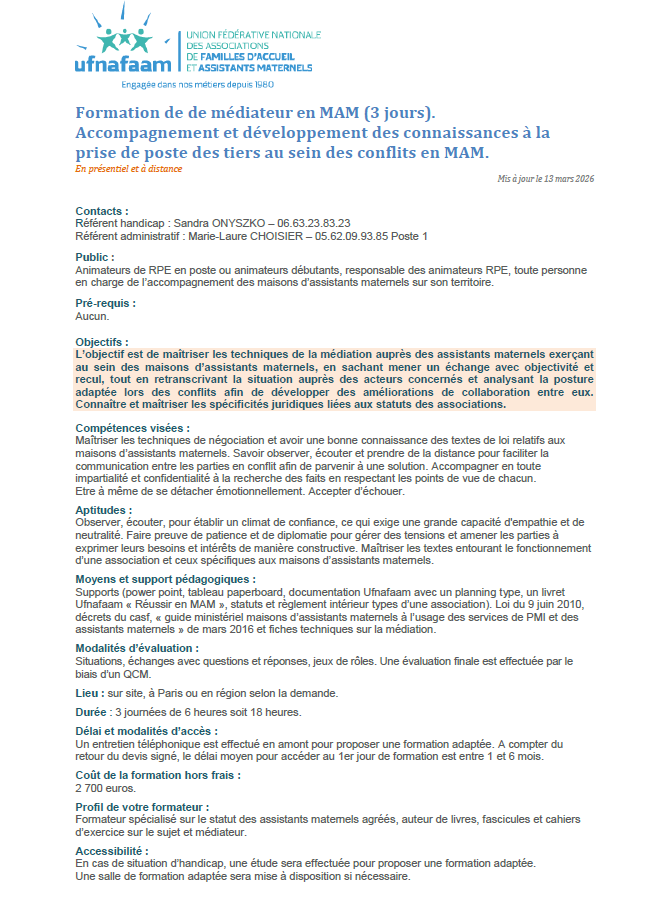 Consultez le programme et inscrivez vos équipes : FORMATION DE MEDIATEUR EN MAM